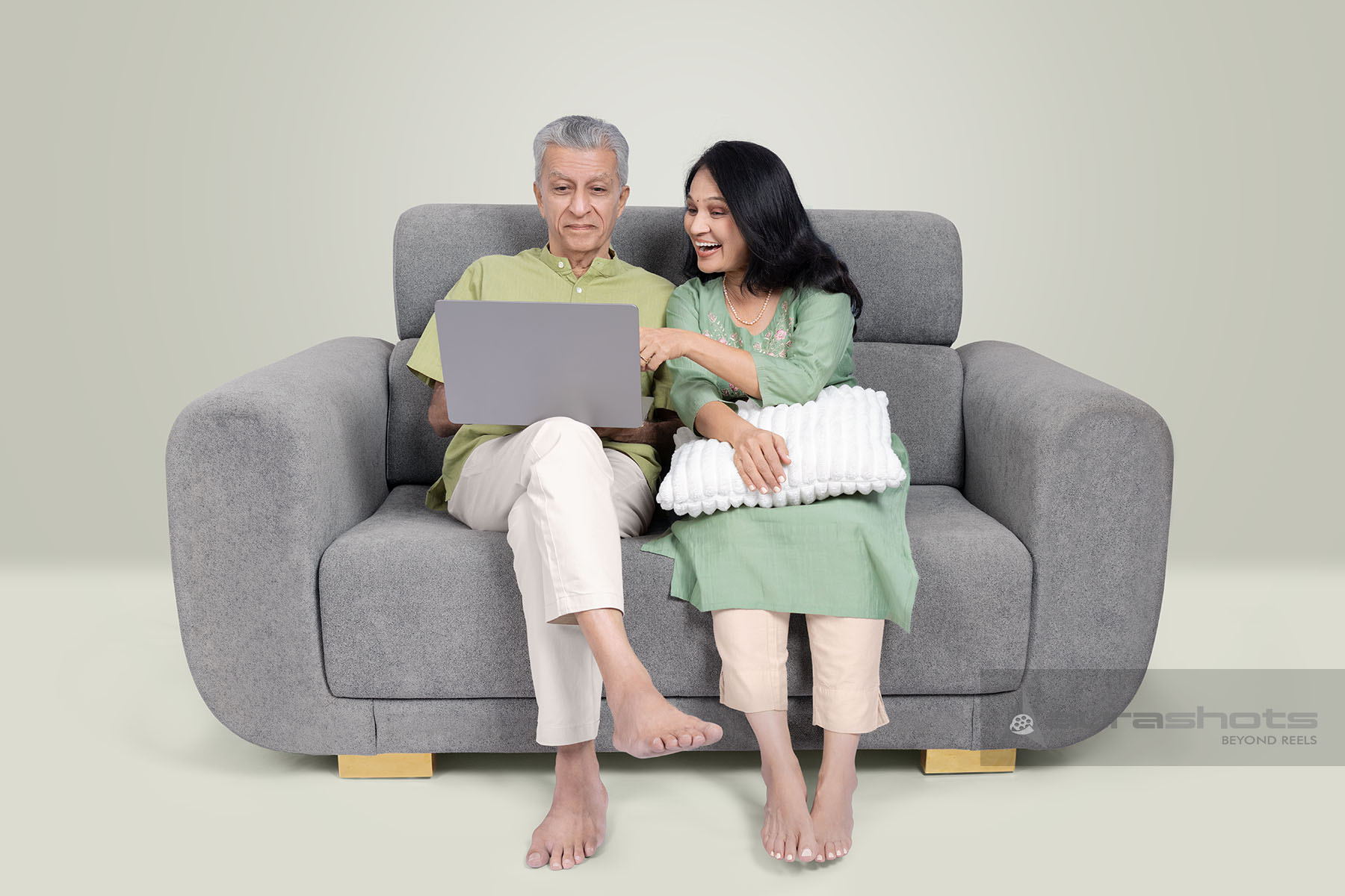 AS25150047-Indian senior couple smiling while browsing laptop together