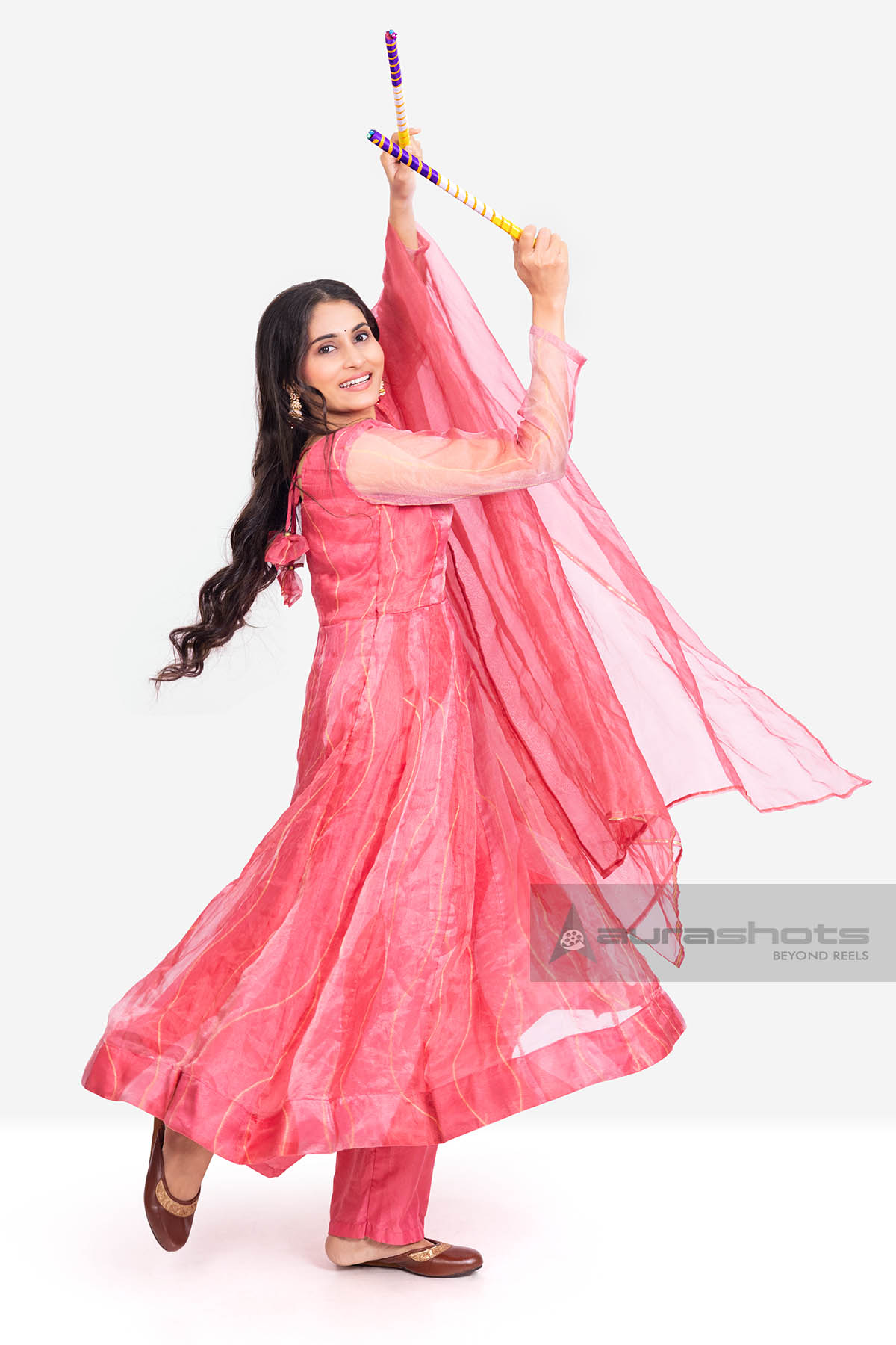 AS26010081-Indian woman dancing in traditional outfit with dandiya sticks
