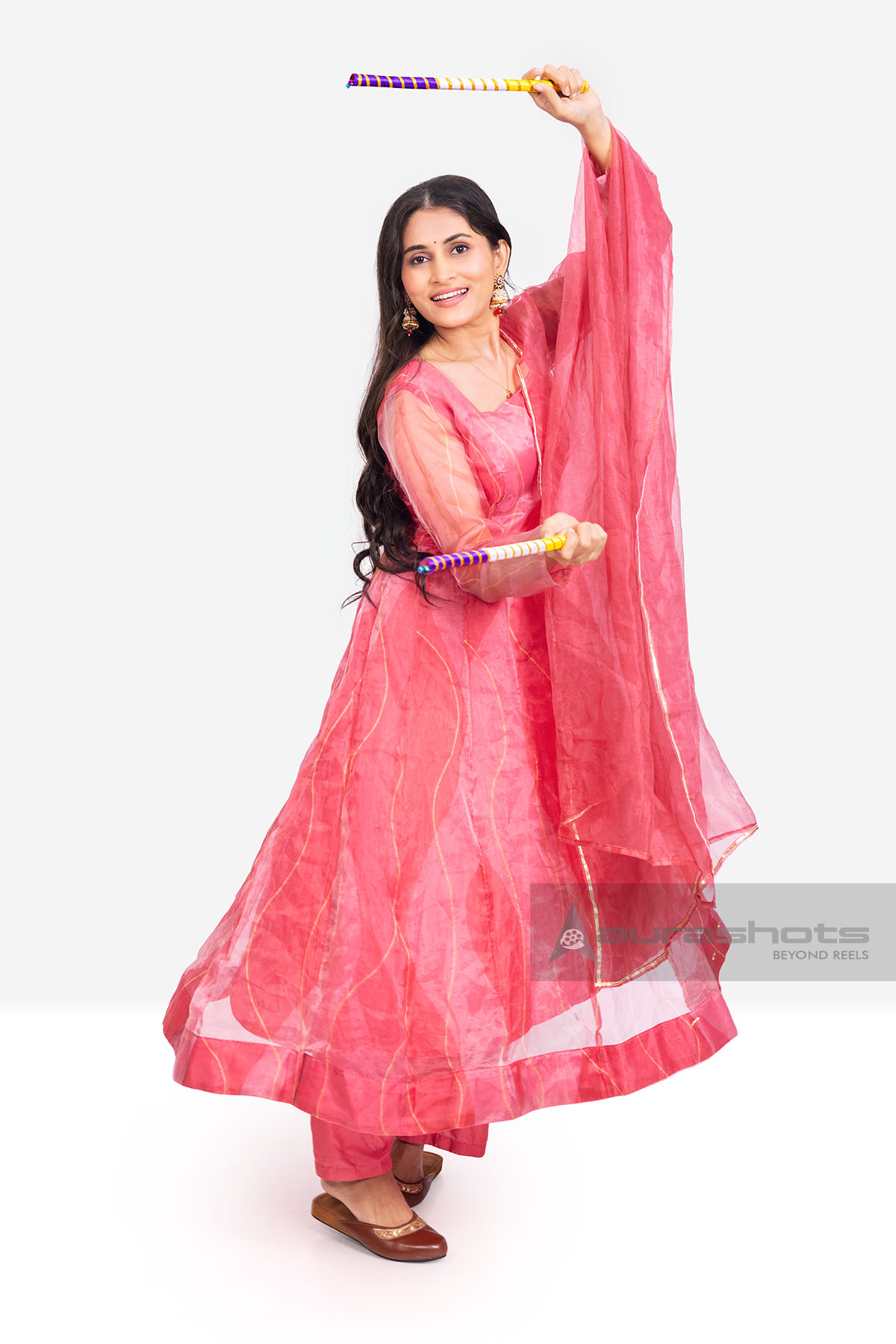 AS26010078-Indian woman dancing with dandiya sticks in festive attire
