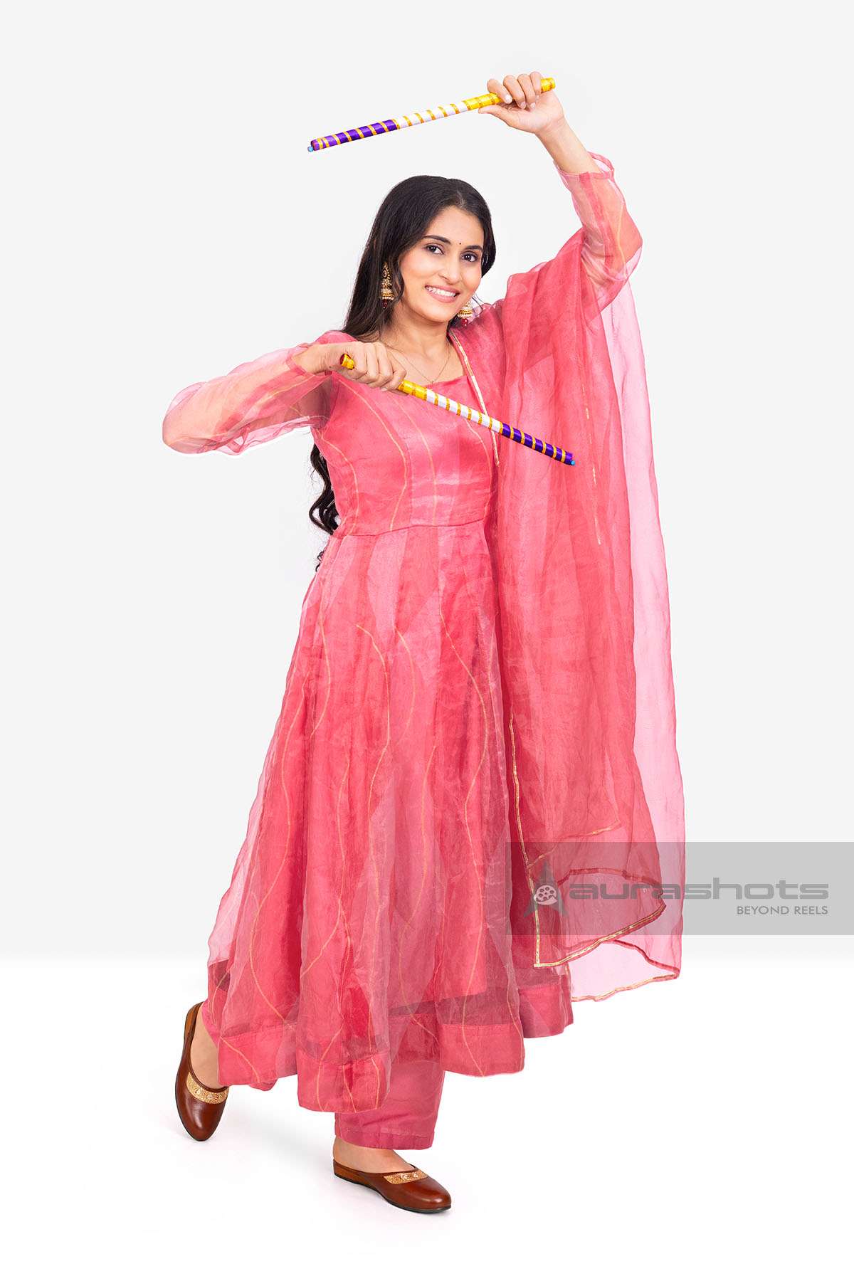 AS26010077-Indian woman dancing with dandiya sticks in festive traditional outfit