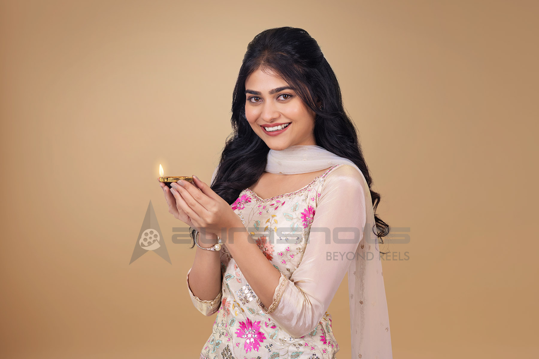 AS25040204-Indian woman holding a diya and smiling in traditional festive attire