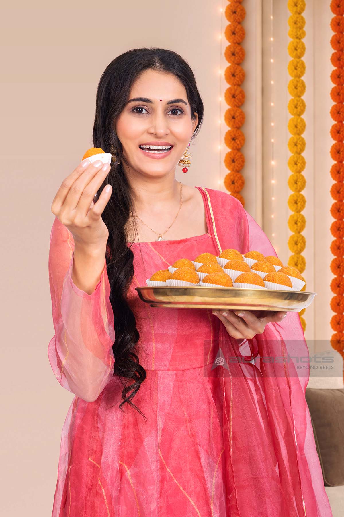 AS26010060-Indian woman holding laddu sweets celebrating festival