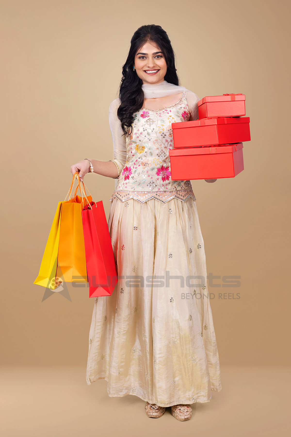 AS25040188-Indian woman holding multiple shopping and gift boxes