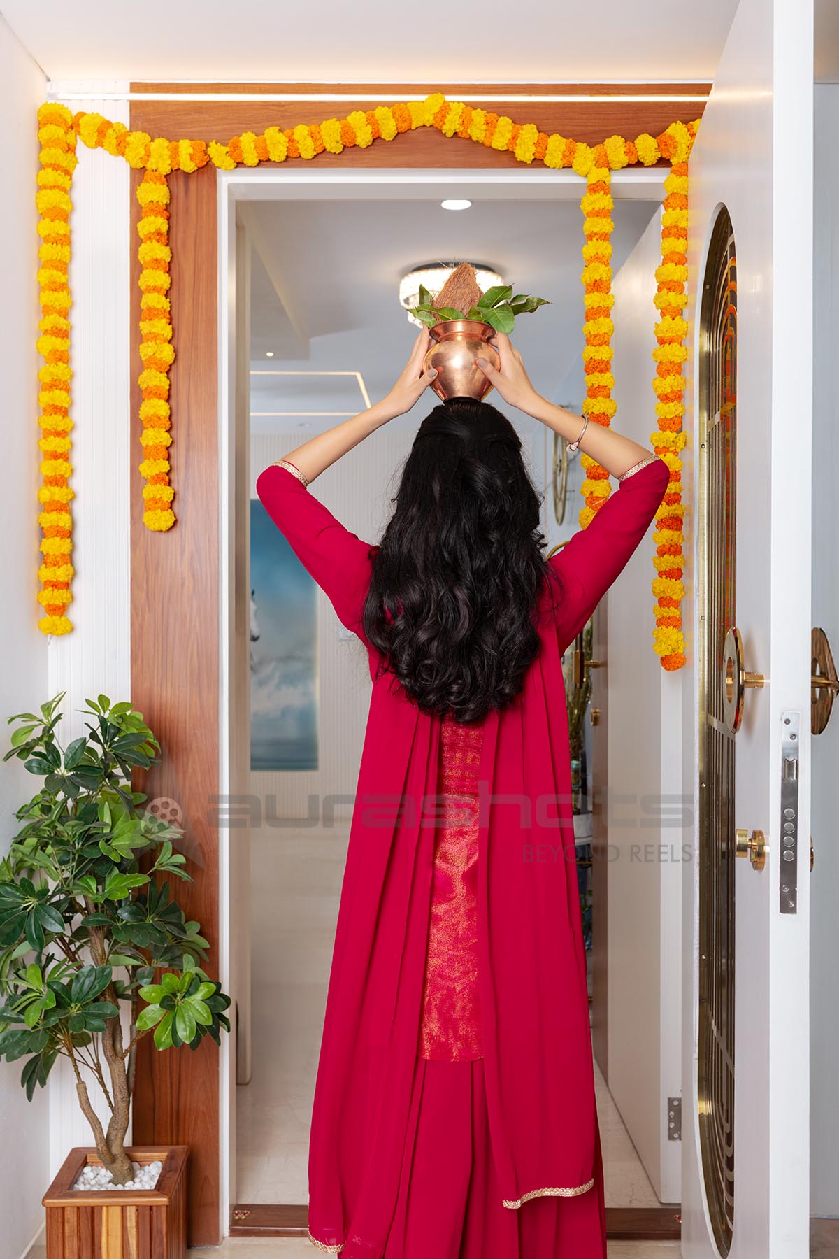 AS25040216-Indian woman performing traditional kalash ritual during house warming puja celebration