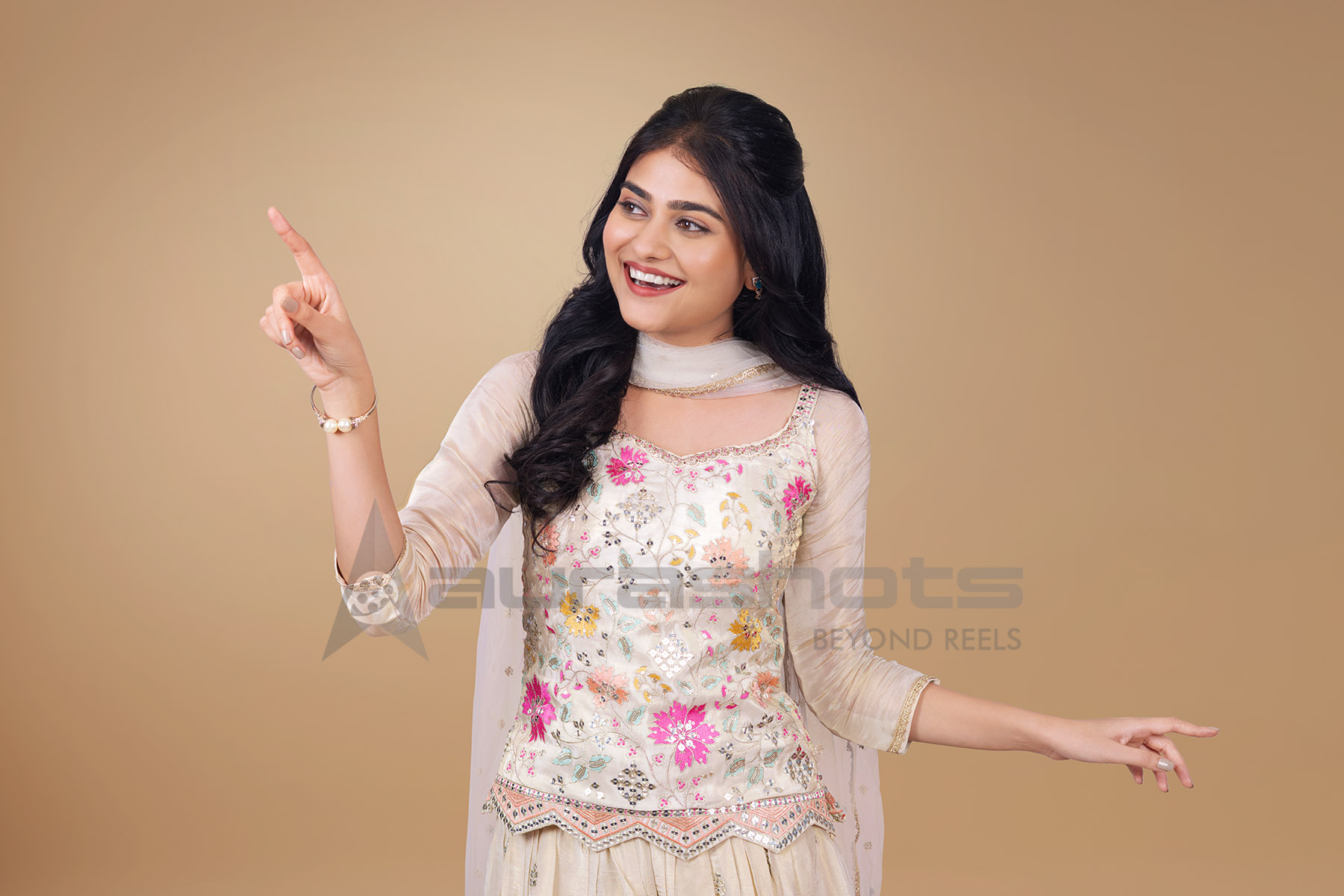 AS25040158-Indian woman pointing towards offer board space