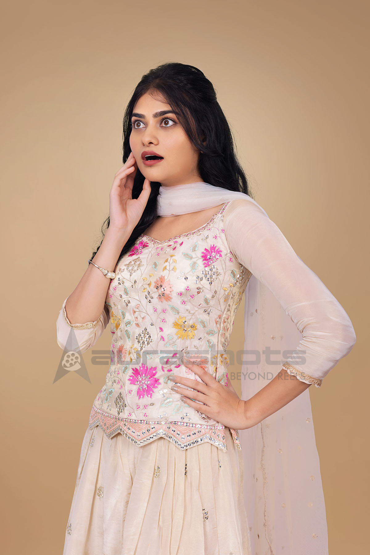 AS25040171-Indian woman surprised expression in festive traditional outfit