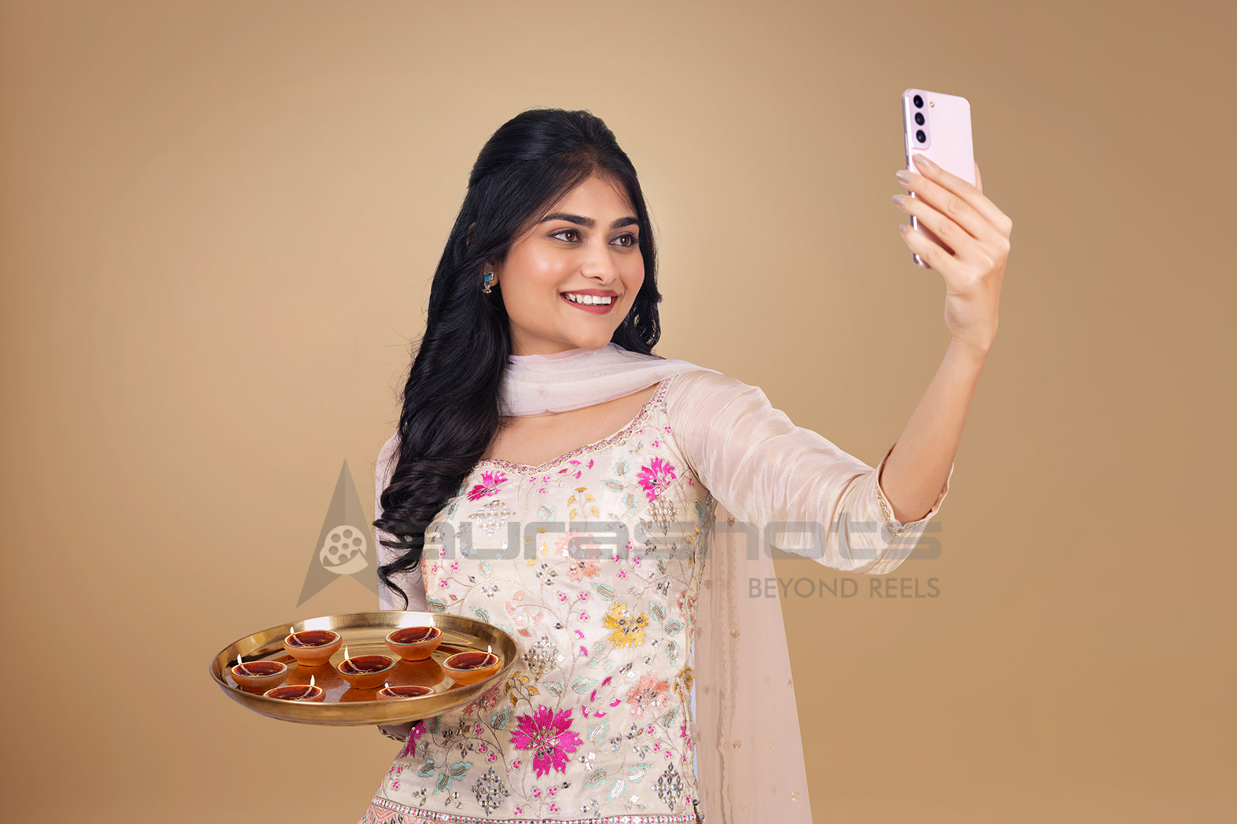 AS25040210-Indian woman taking selfie while holding a pooja thali