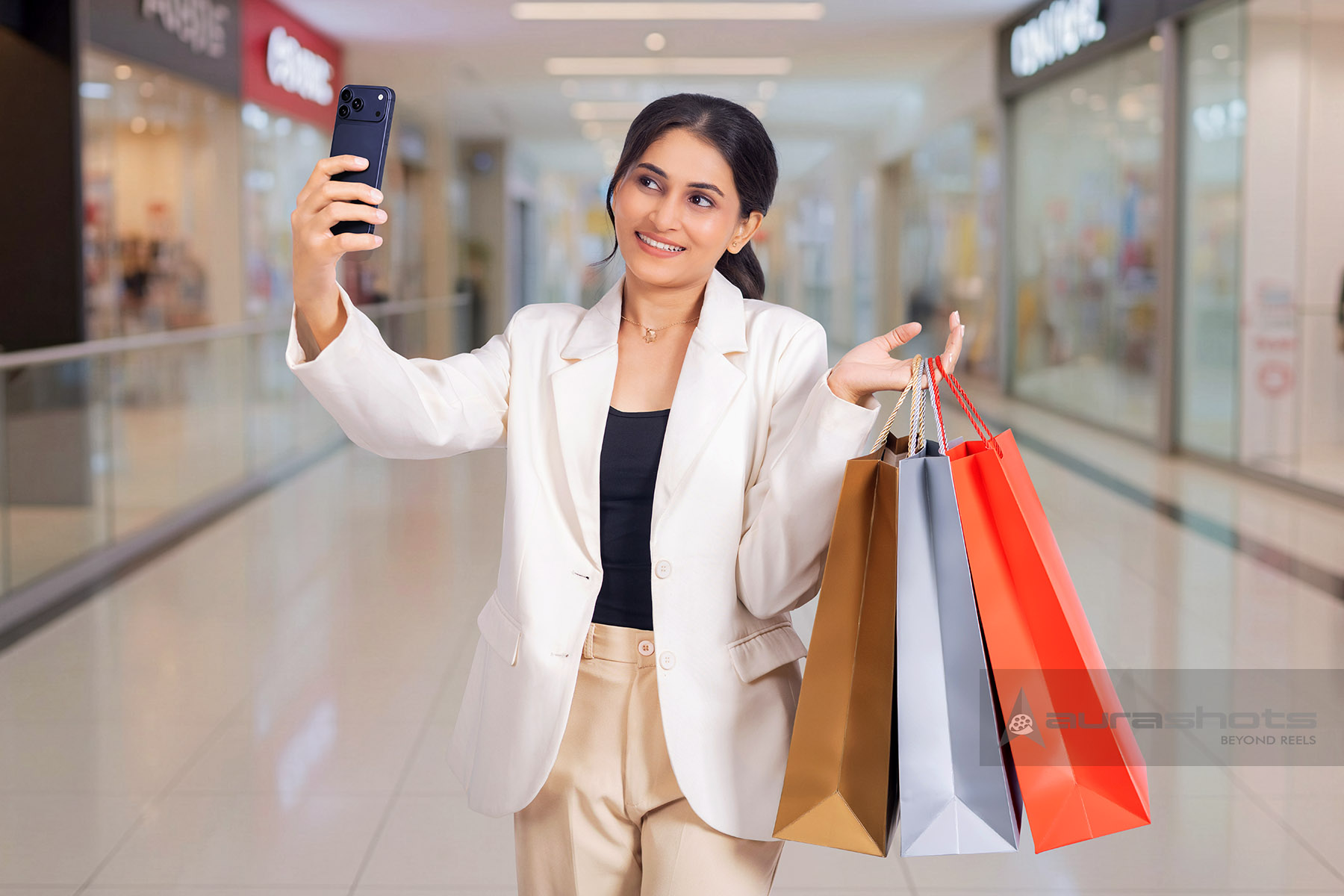 AS26030243-Indian woman taking selfie with shopping bags in shopping mall