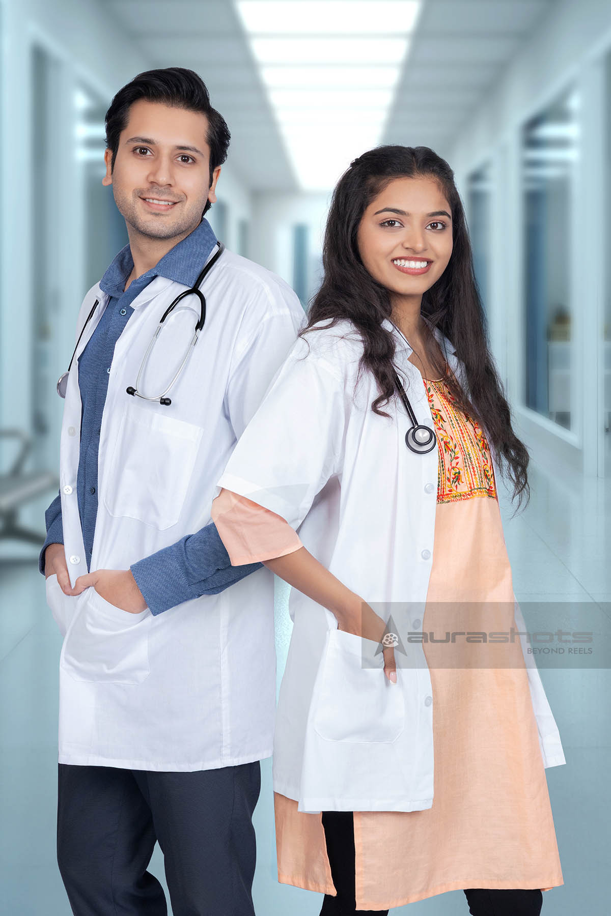 AS25110266-Professional Male and Female Doctors Standing in Hospital Corridor