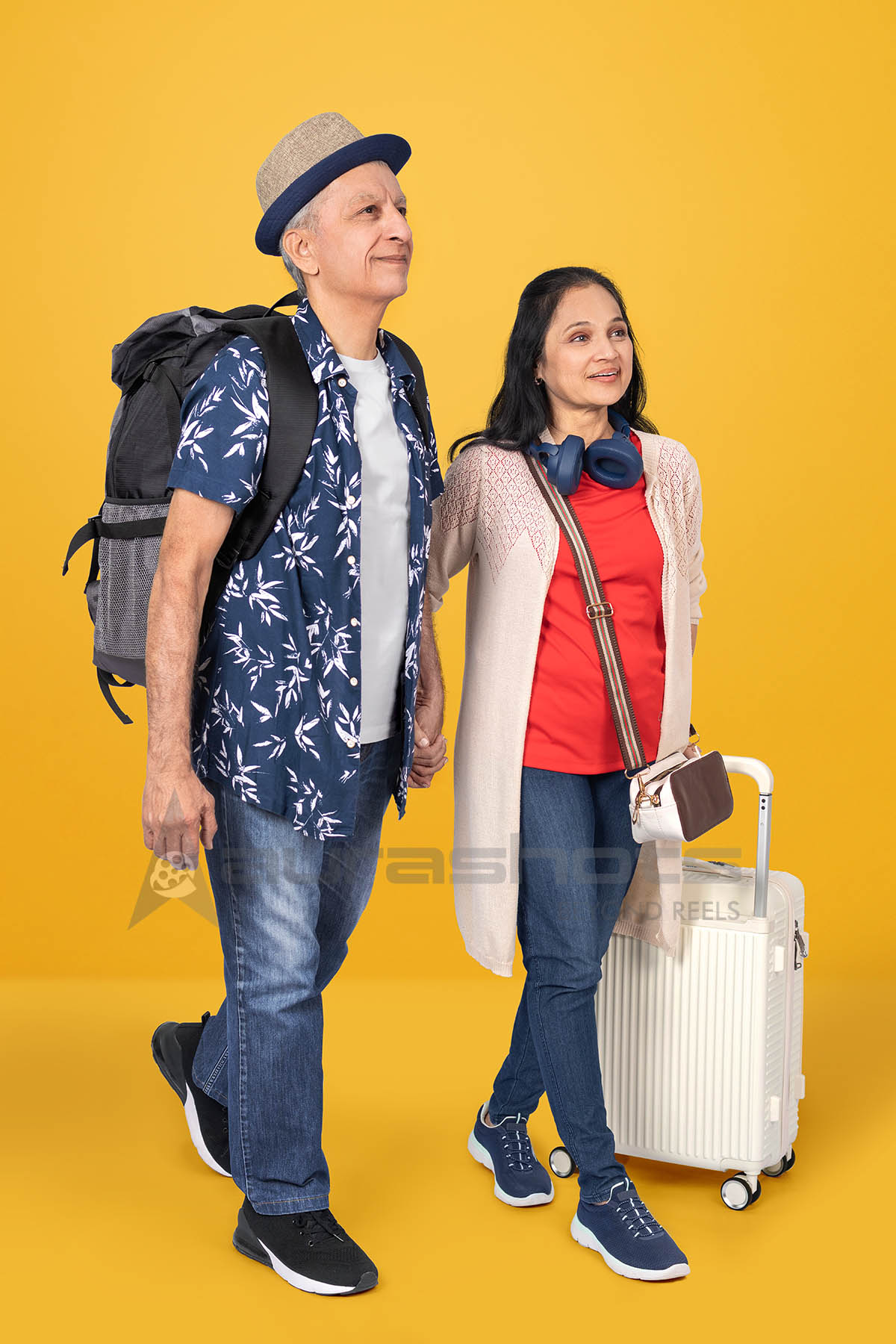 AS25090166-Senior couple walking with backpack and suitcase
