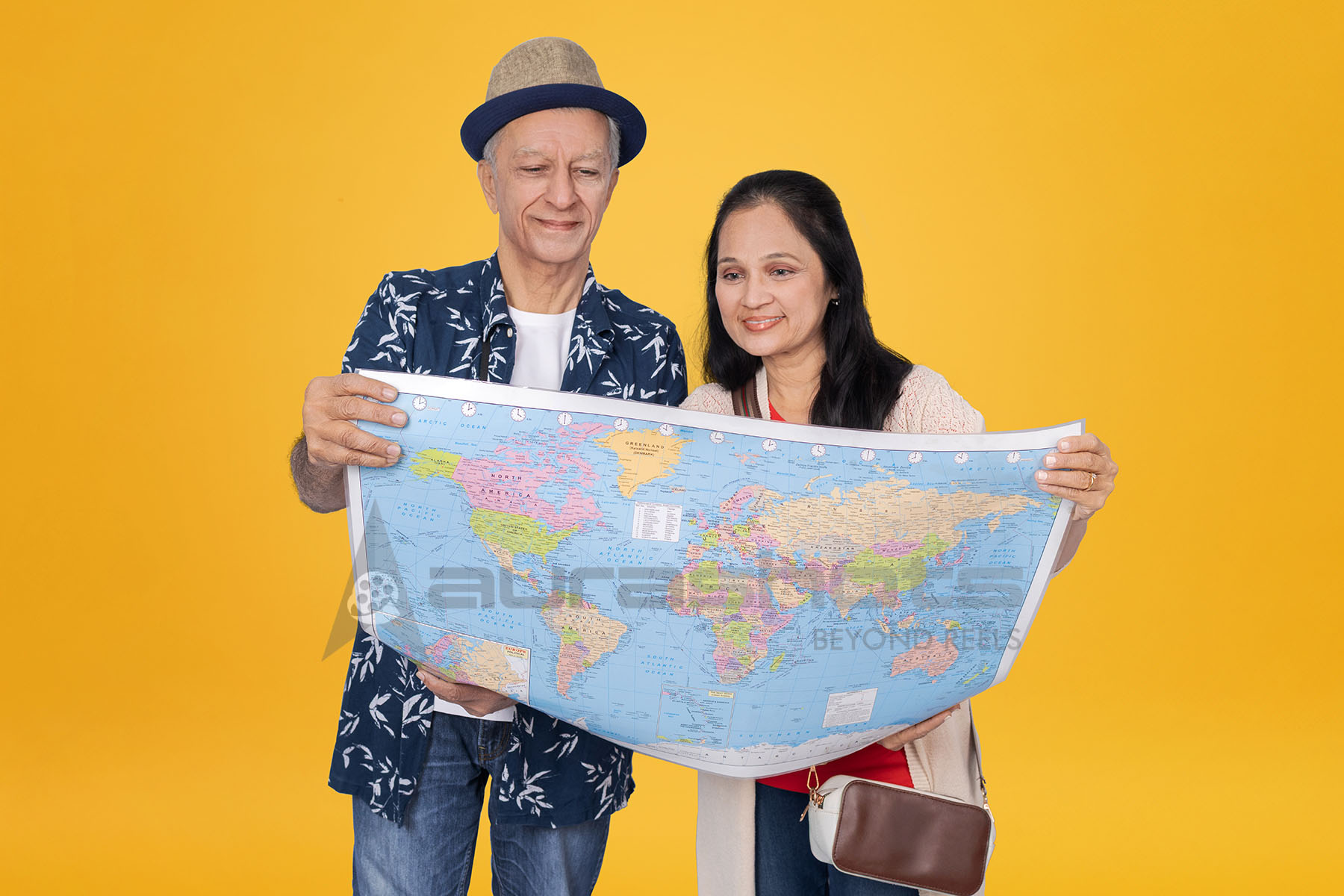 AS25090233-Senior Indian Couple Planning International Vacation with World Map