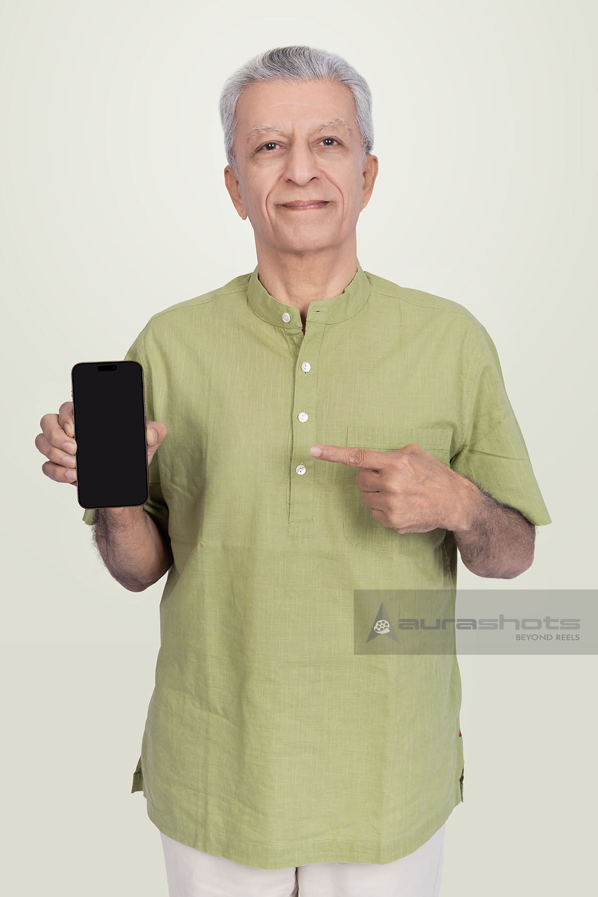 AS25150148-Senior Indian man showing smartphone for mobile app
