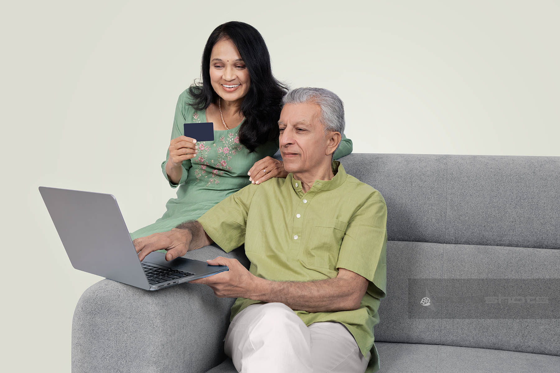 AS25150037-Senior man using laptop while woman making online payment with credit card