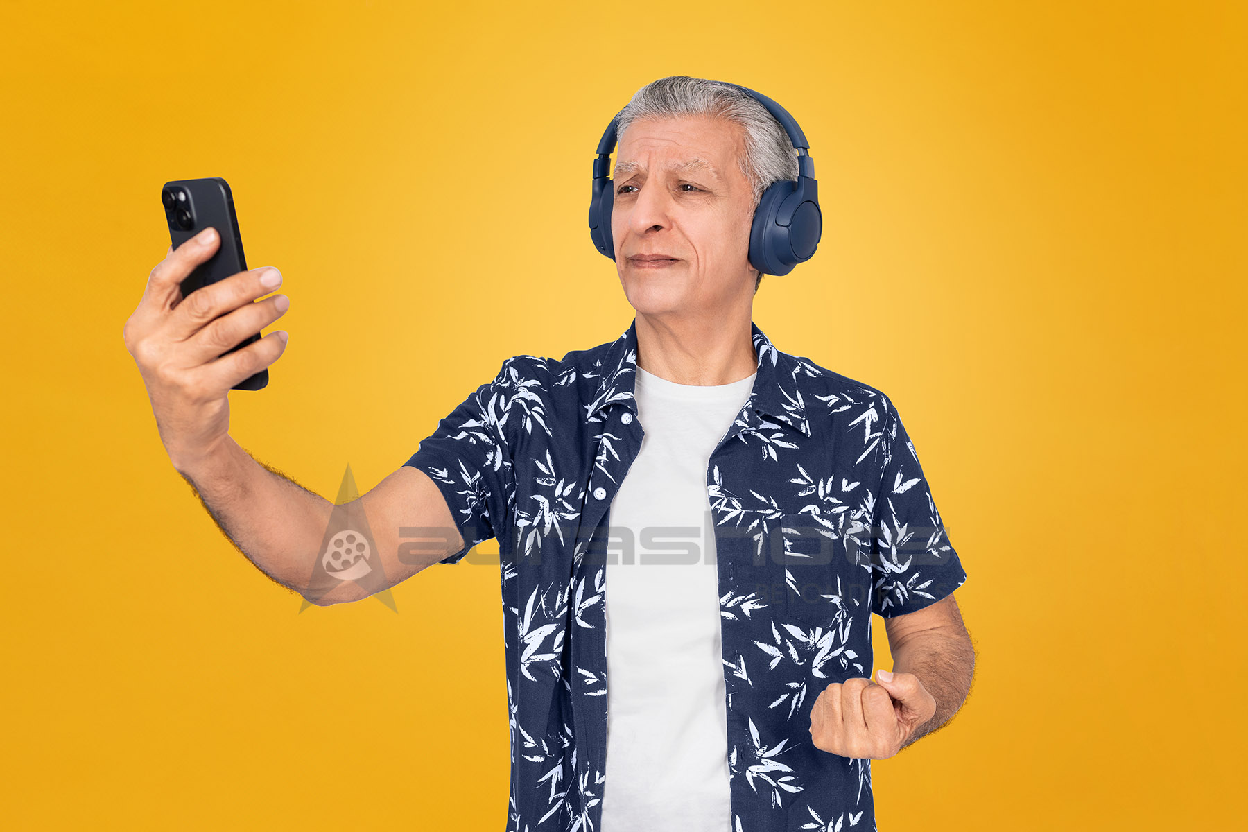 AS25090007-Senior Man with headphone taking selfie on smartphone
