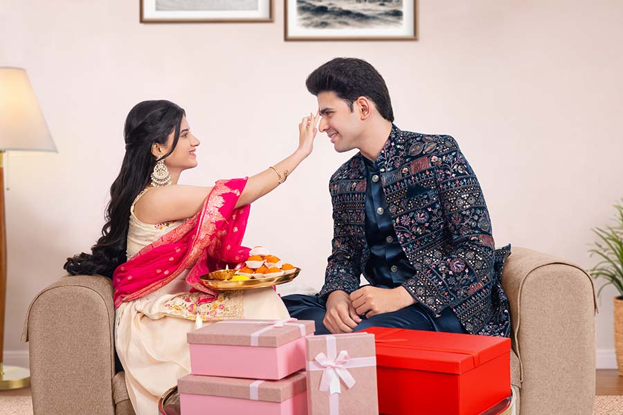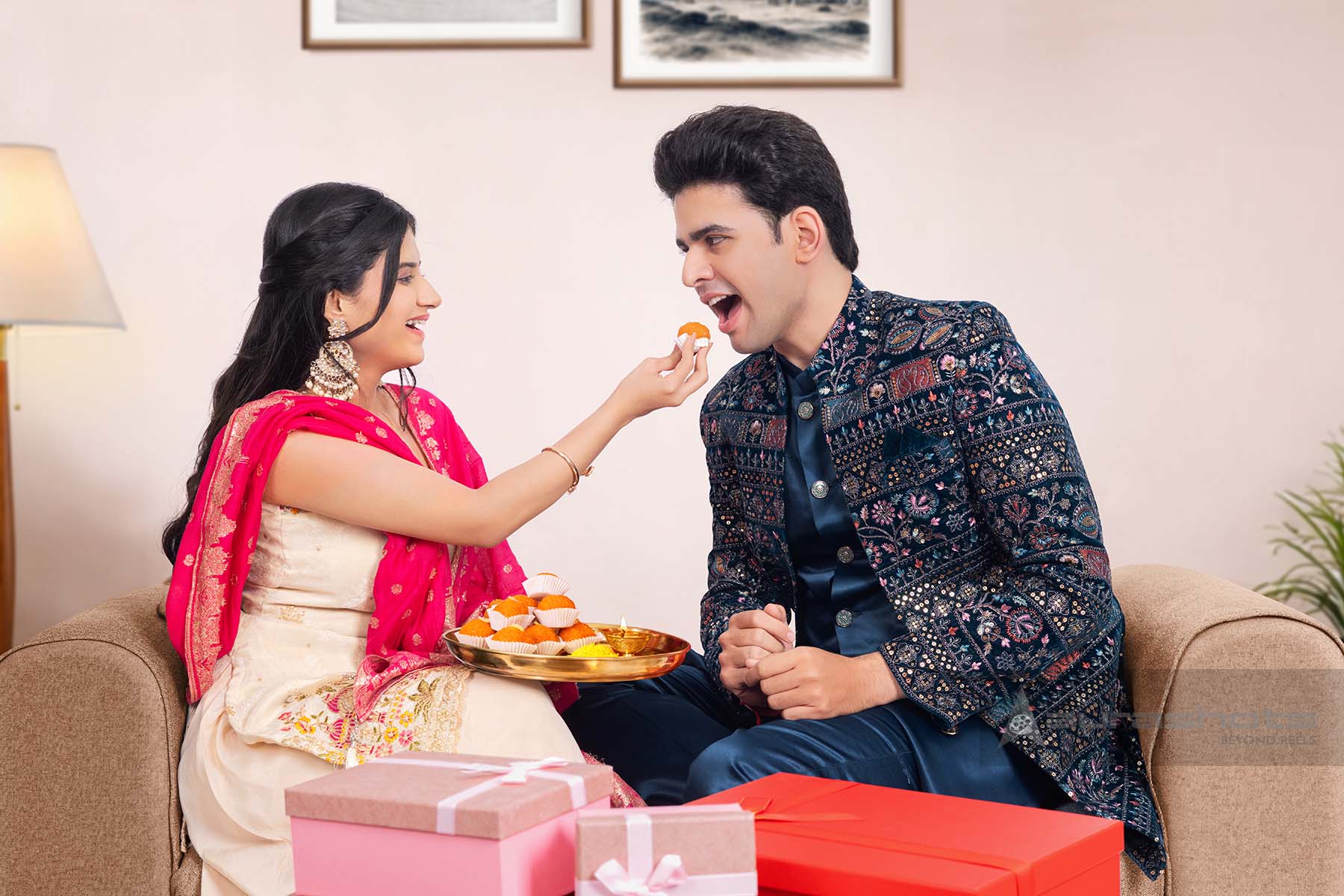 AS26060023-Sister feeding sweet to brother during Raksha Bandhan celebration