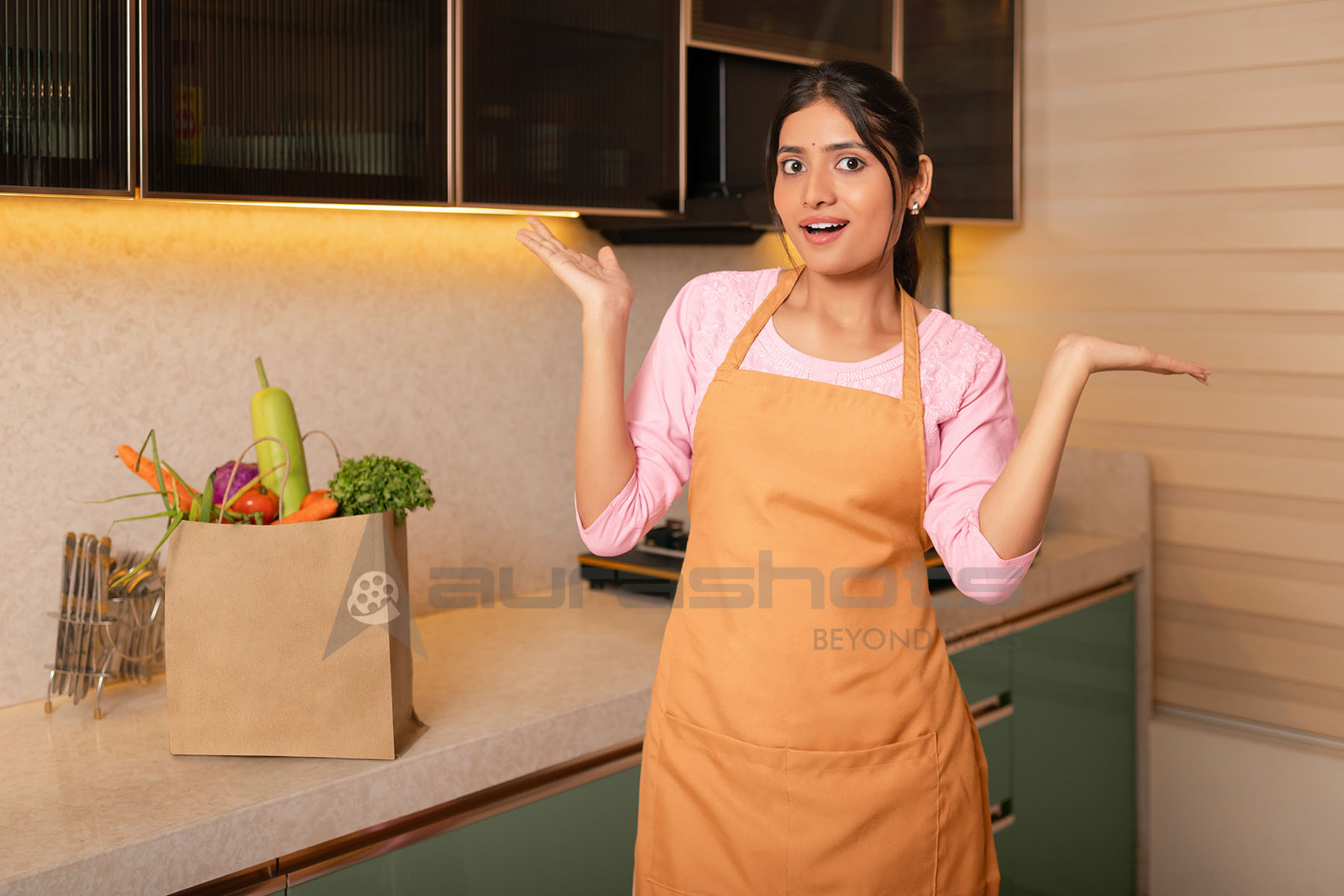 AS25021157-Surprised woman with grocery delivery in kitchen