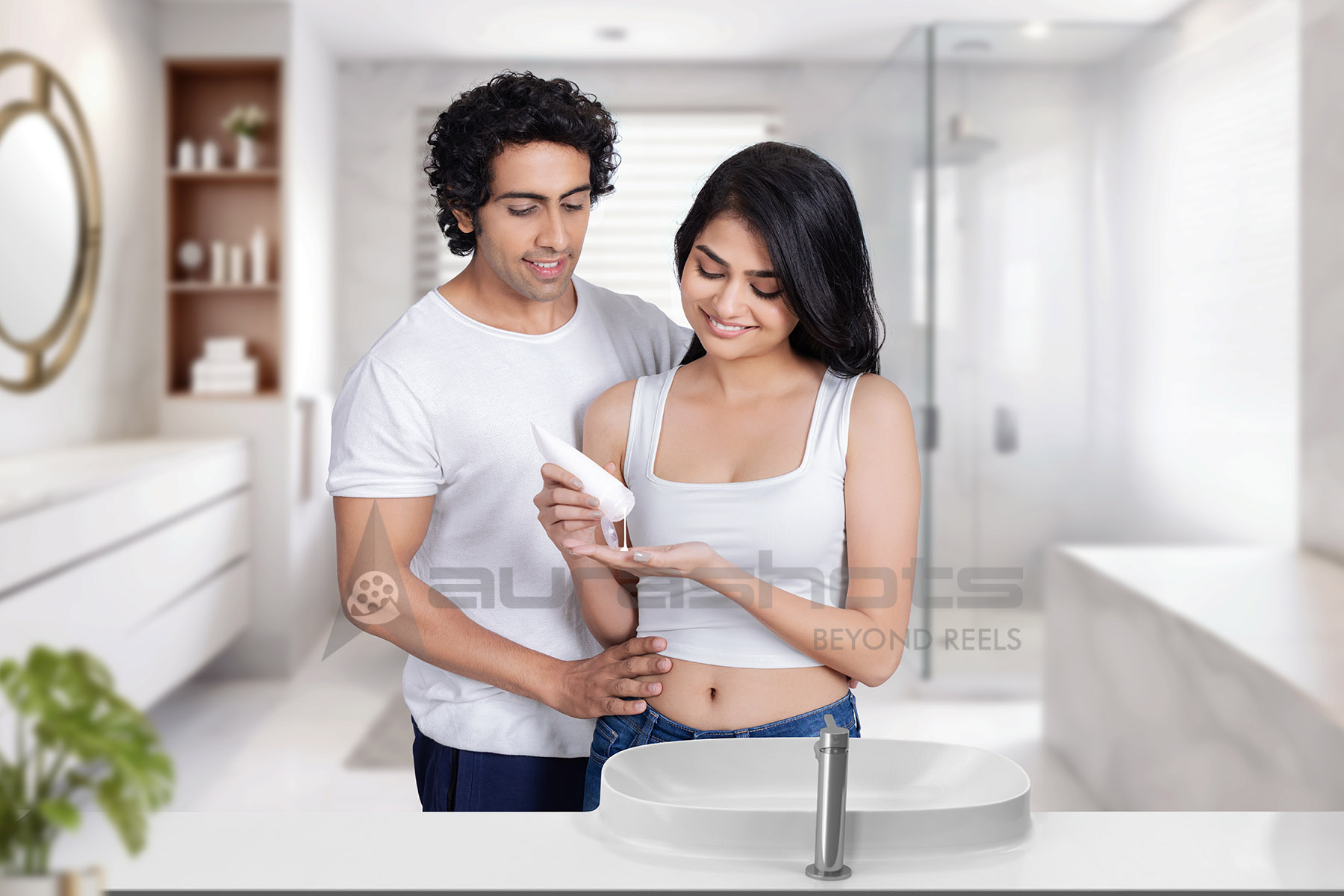AS25030537-Young couple smiling while applying lotion