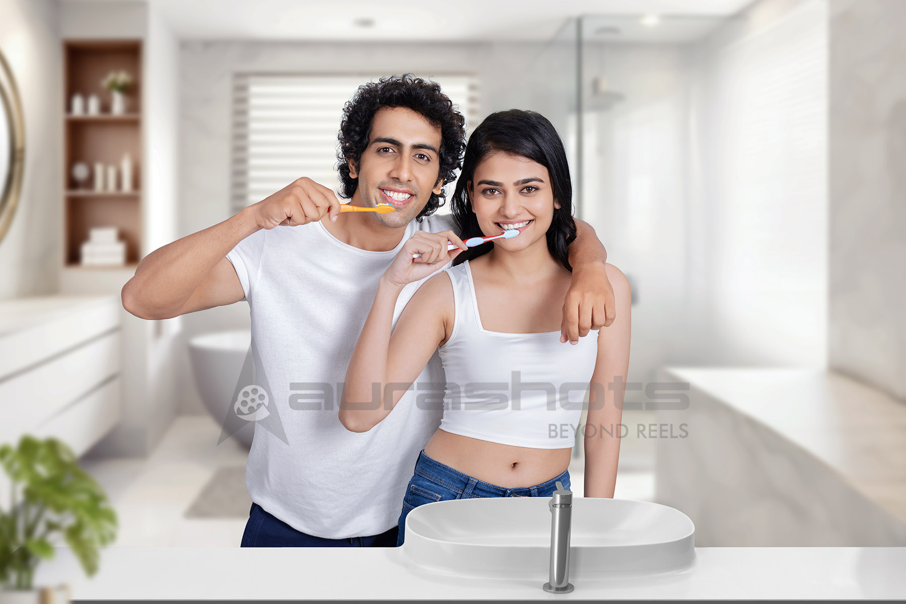 AS25030569-Young couple smiling while brushing teeth together