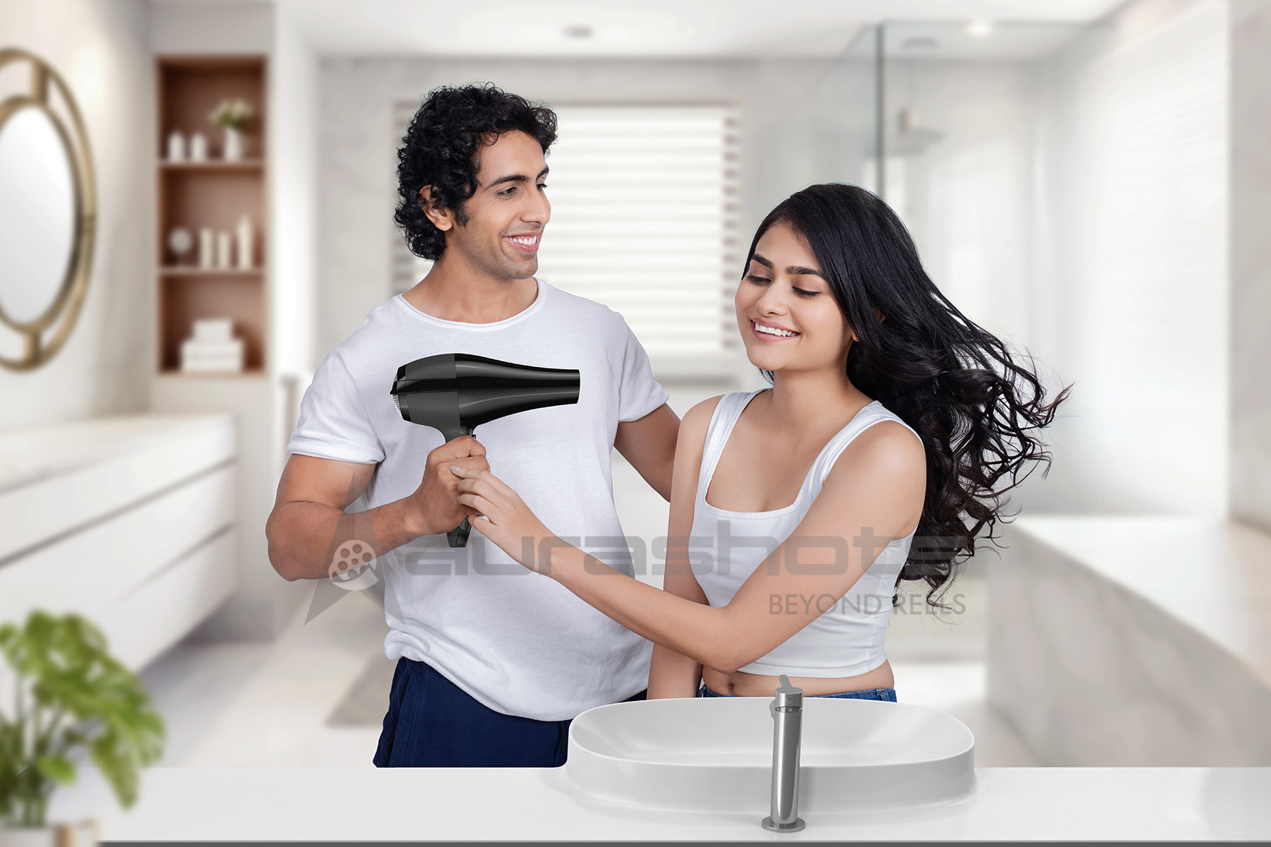 AS25030580-Young couple smiling while drying hair with hairdryer