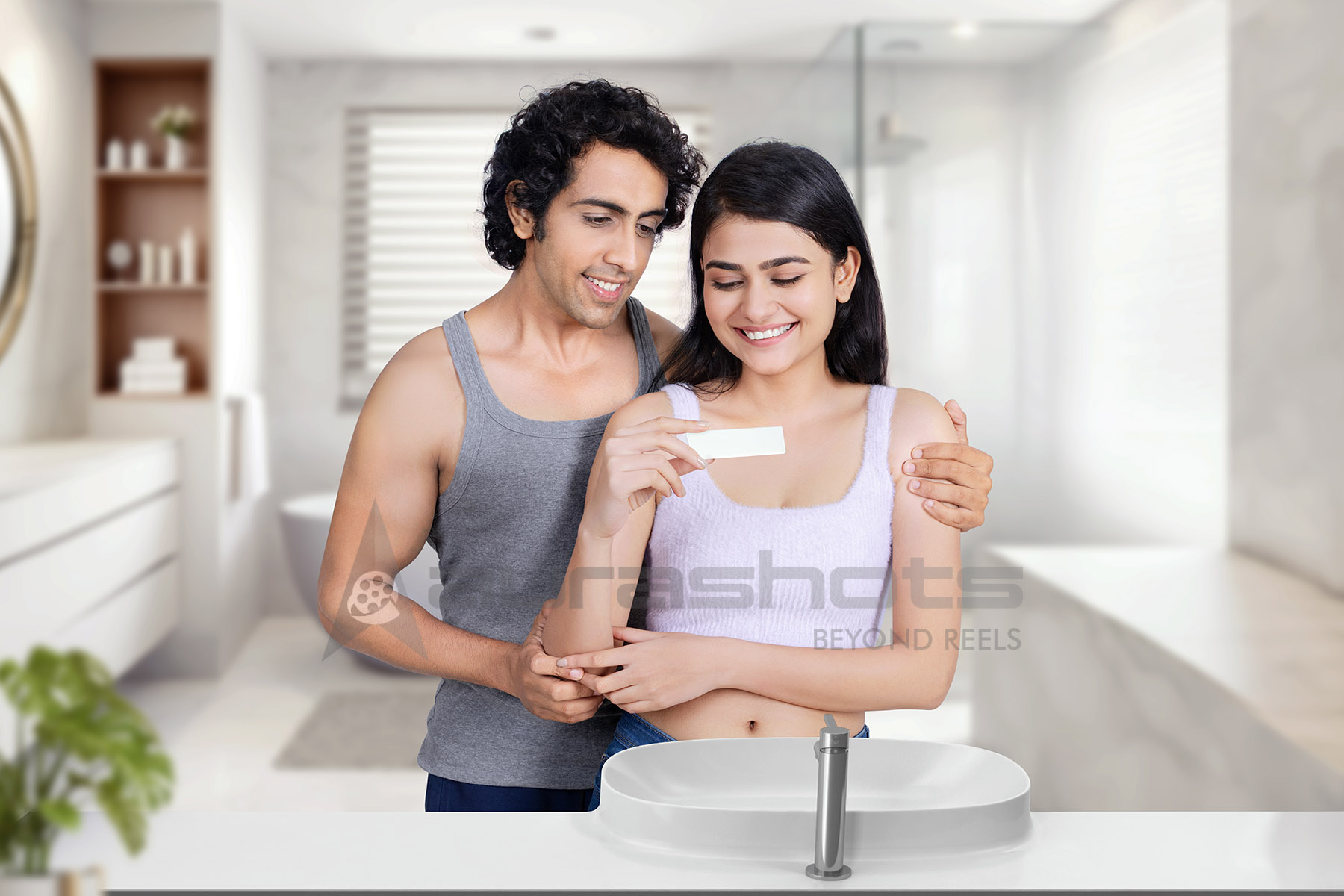 AS25030599-Young couple smiling while holding pregnancy test kit