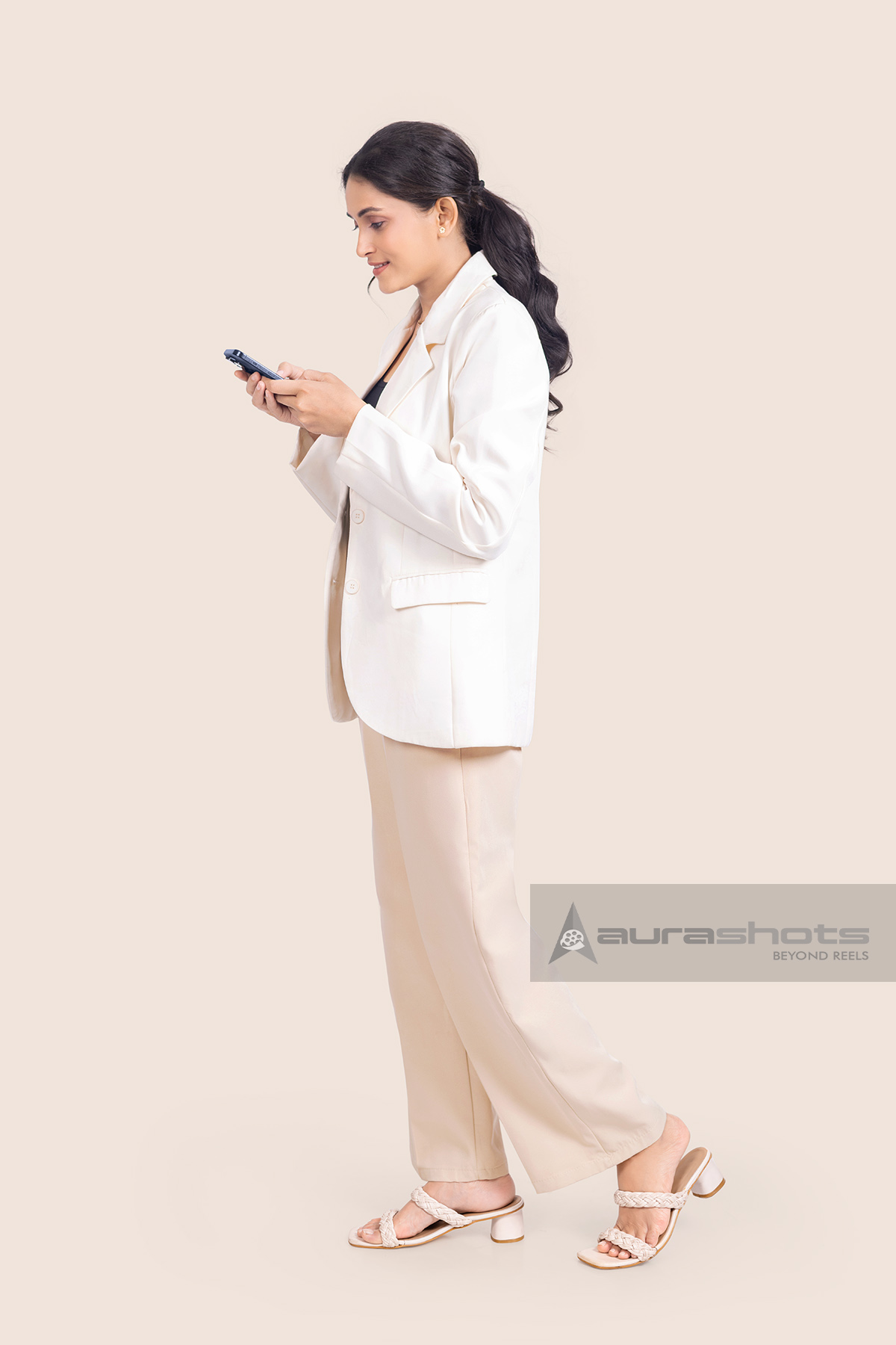 AS26030246-Young Indian businesswoman walking while using smartphone in studio
