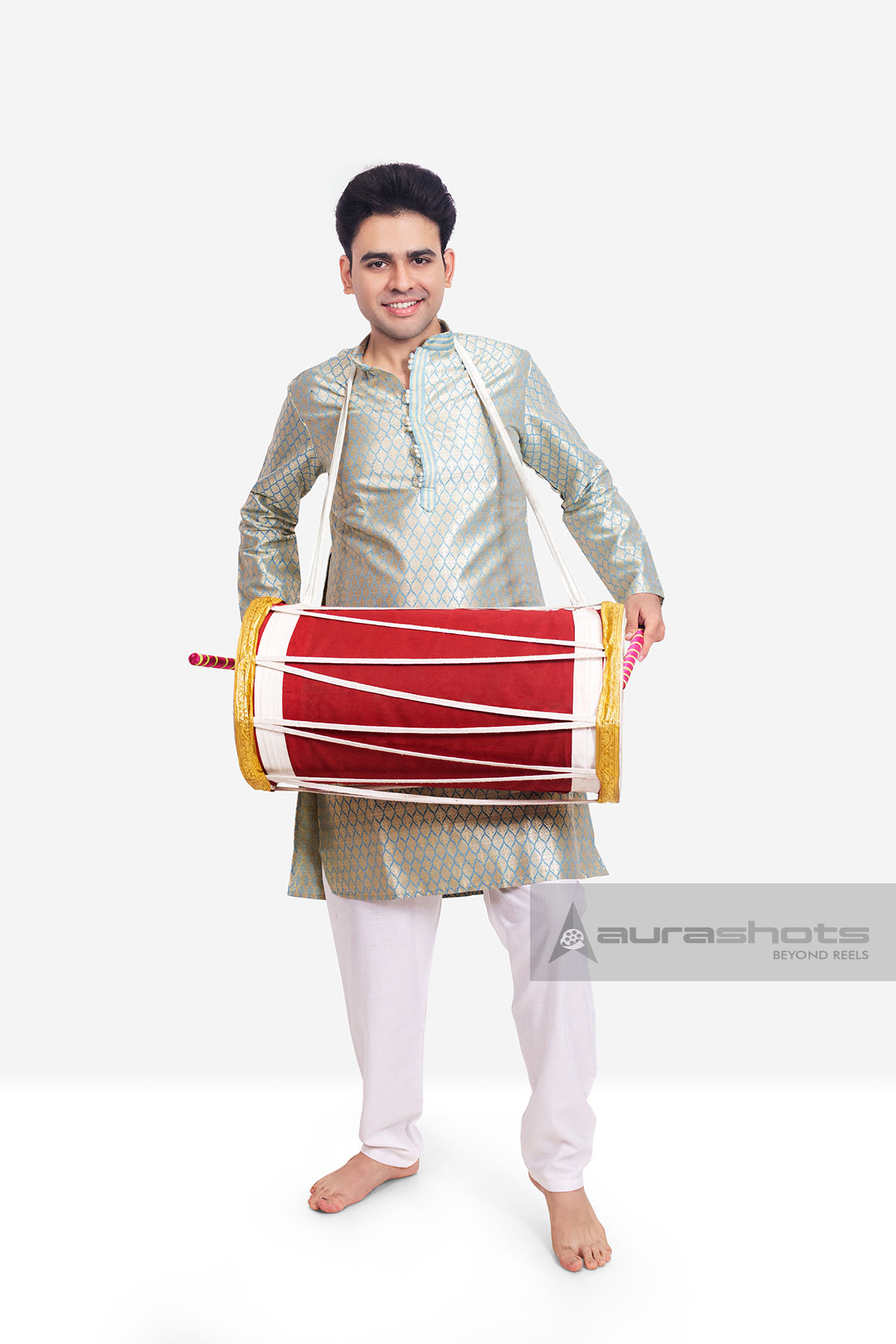 AS26010208-Young Indian man playing dhol during vibrant festive celebration