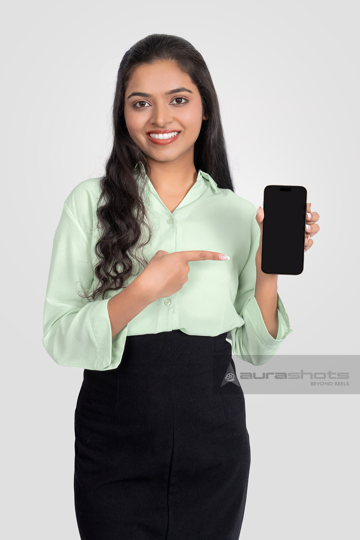 AS25080097-Young Indian Woman Pointing at Smartphone Screen