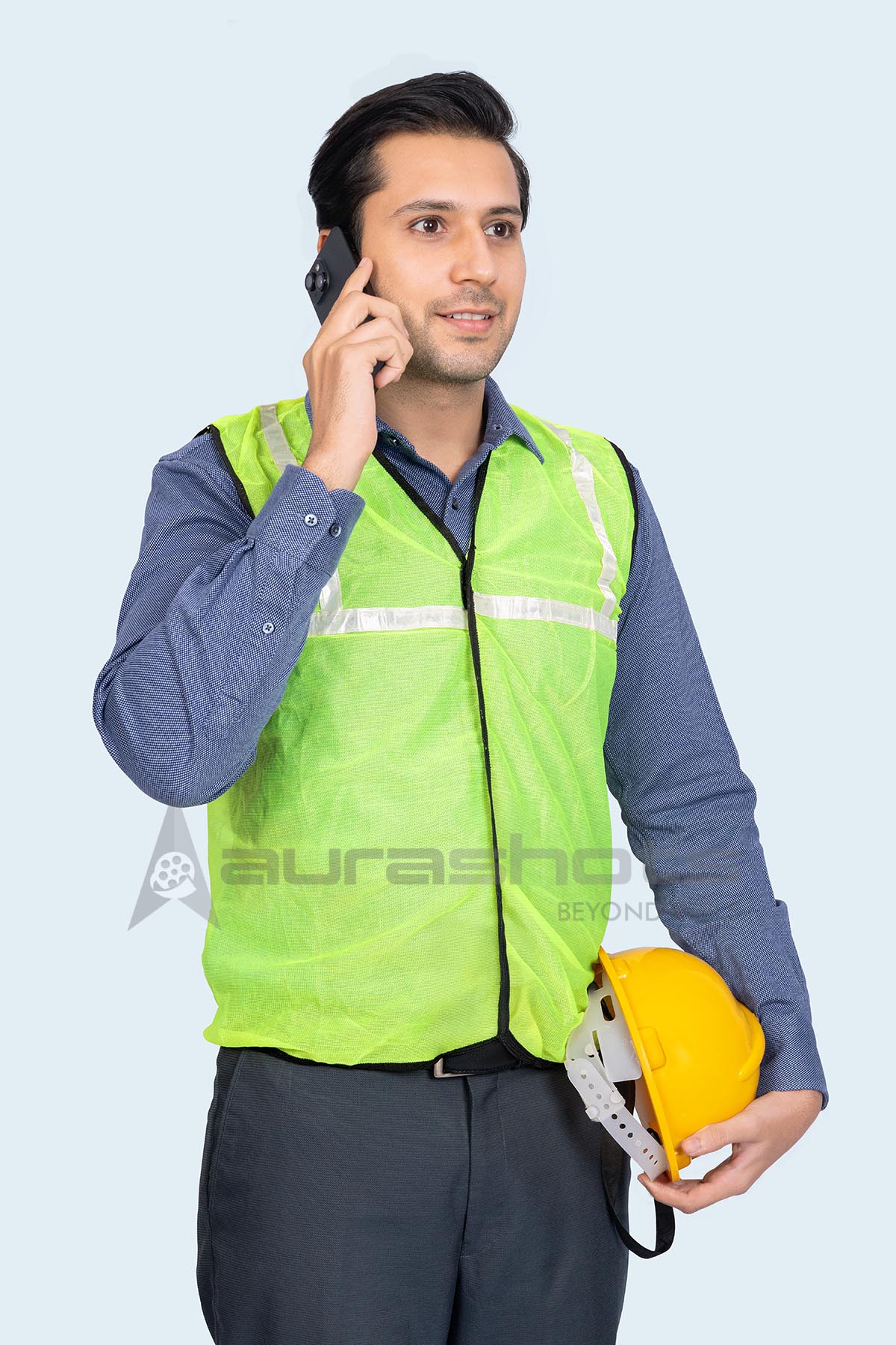 AS25120046-Young male construction engineer talking on phone holding helmet