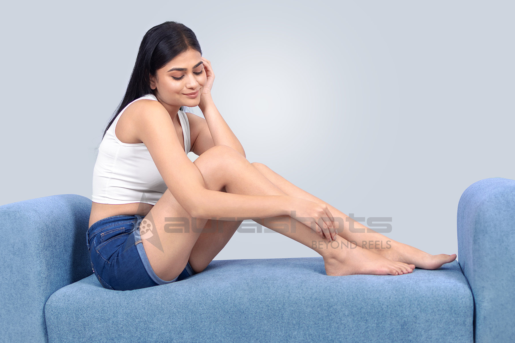 AS25030150-Young woman sitting on couch and feeling her smooth legs