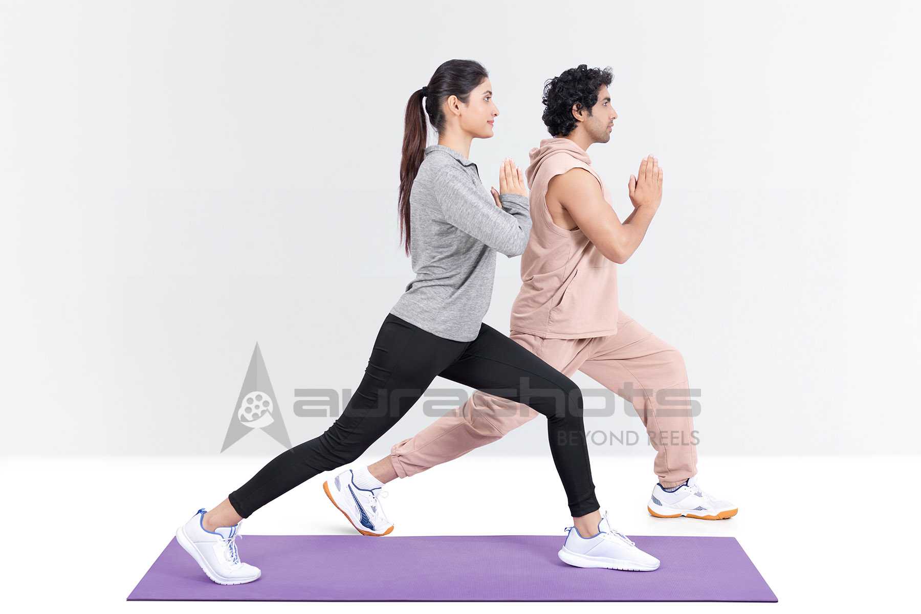 AS25020484-Indian fitness couple facing each other in lunge stretch