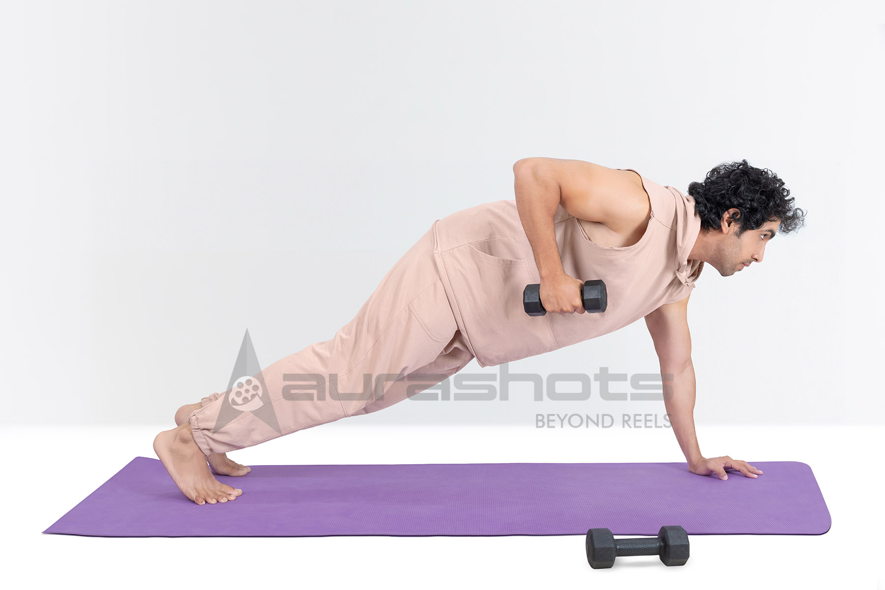 AS25020212-Indian man doing Plank Row with dumbbell on yoga mat for total-body strength