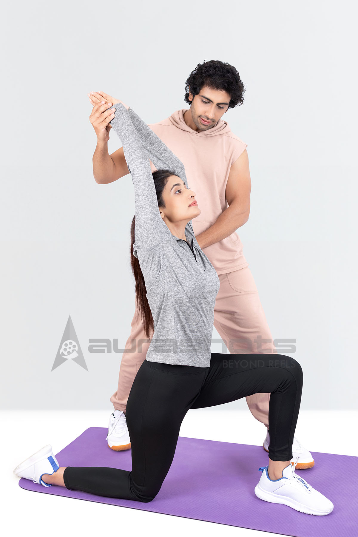 AS25020538-Indian man helping woman do yoga lunge stretch