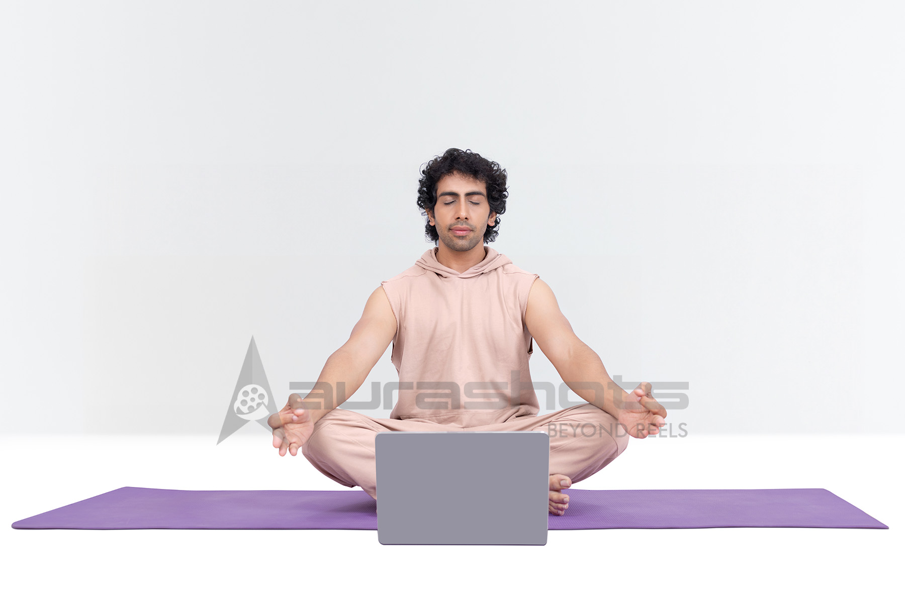 AS25020151-Indian man in Padmasana Lotus Pose with laptop on mat