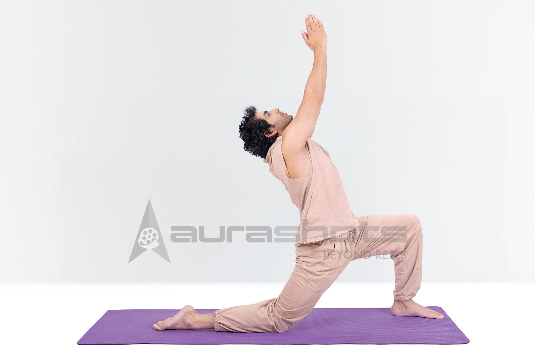 AS25020235-Indian man performing Low Lunge Anjaneyasana raising arm in backbend stretch