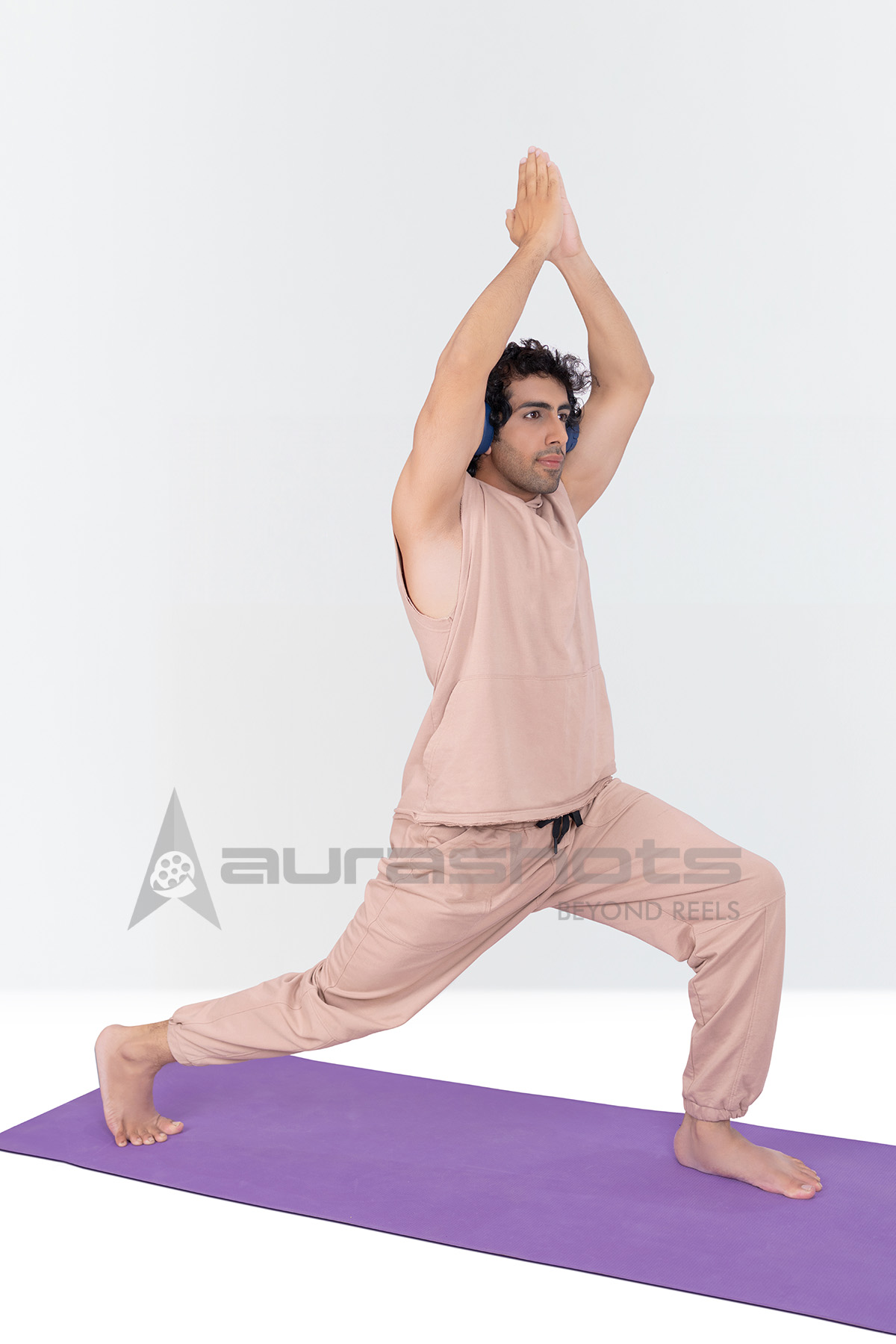 AS25020168-Indian man practicing virabhadrasana pose with raised arms on mat