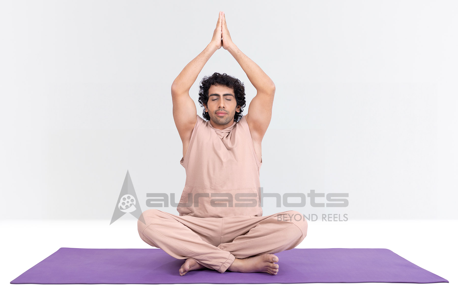 AS25020096-Indian man raising arms in Parvatasana Mountain Pose seated
