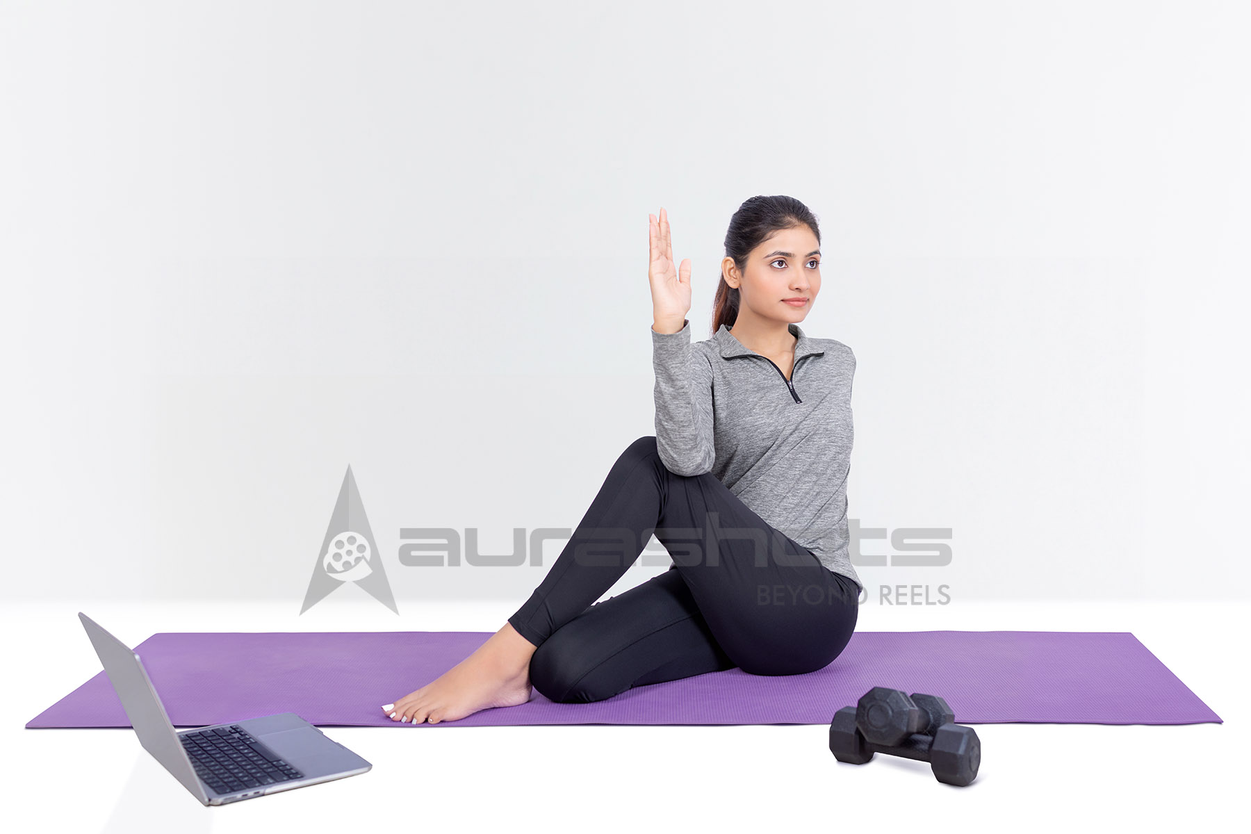 AS25020073-Indian woman performing Ardha Matsyendrasana Half Spinal Twist with laptop in front