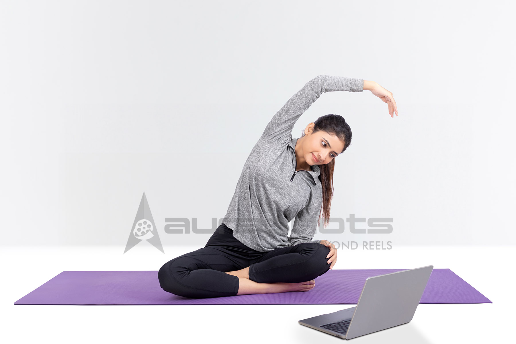 AS25020307-Indian woman performing seated side body stretch while looking at laptop
