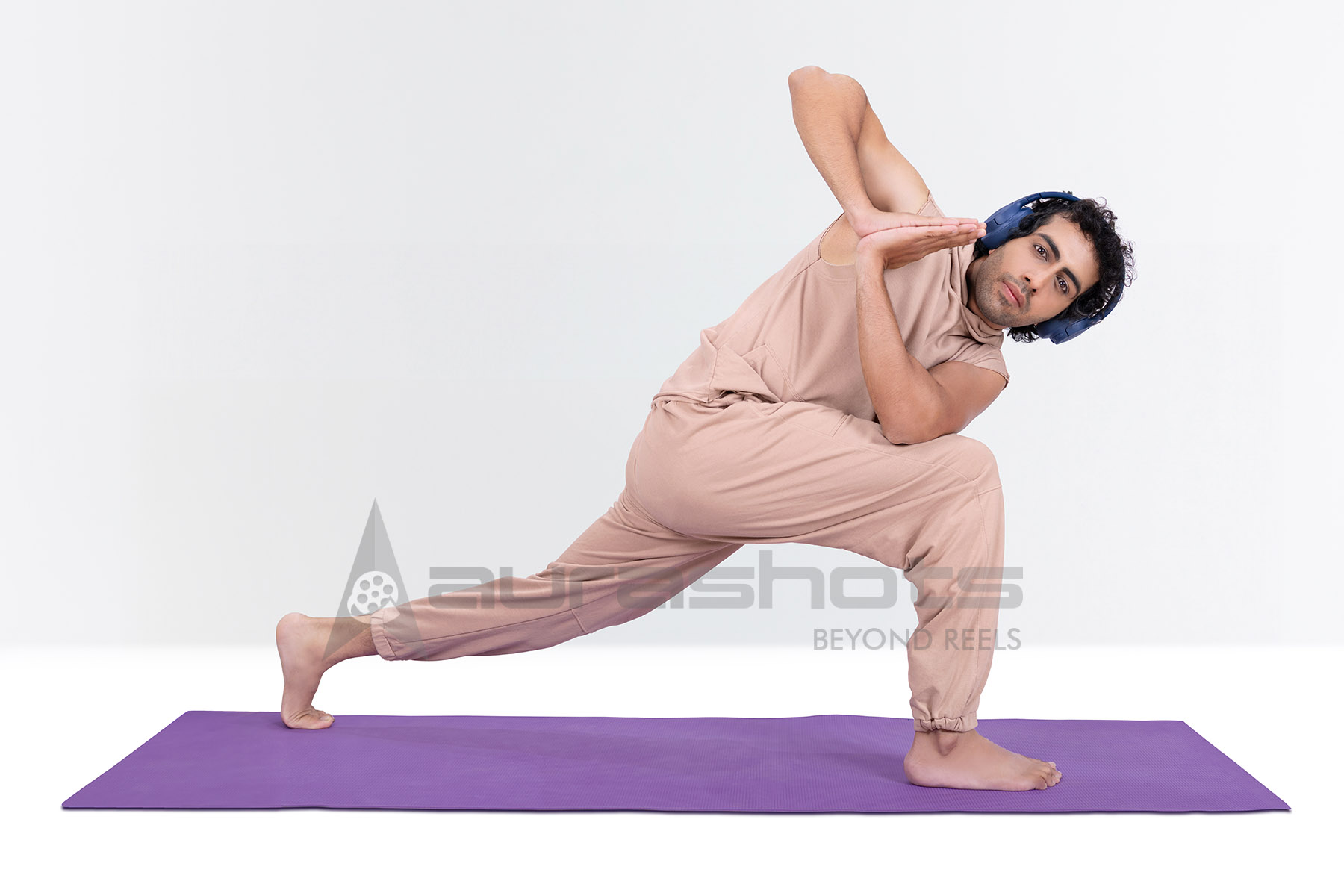 AS25020163-Young Indian man performing a deep lunge twist yoga pose on mat while lisening music