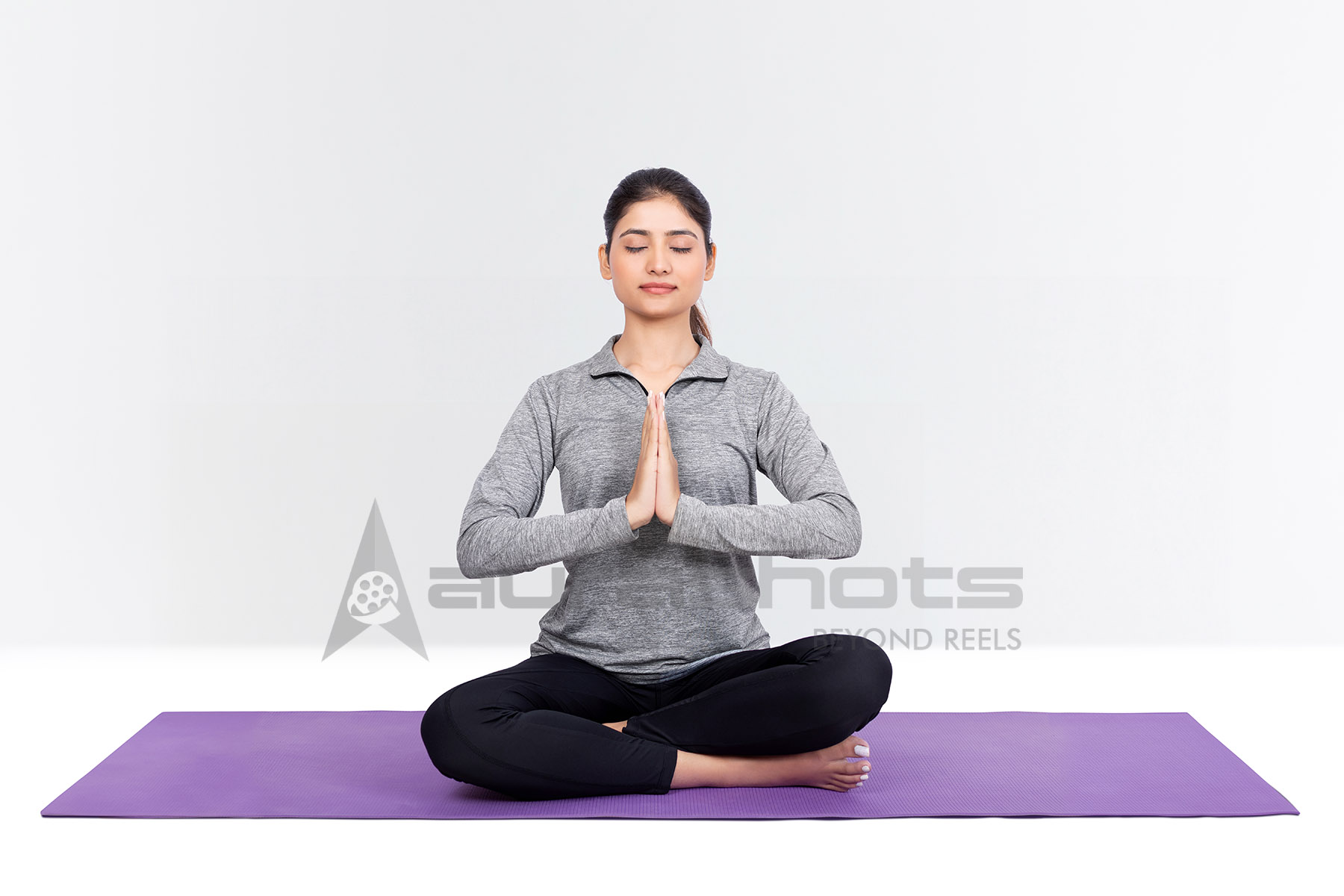 AS25020016-Young Indian woman in Namaste Prayer Pose sitting cross-legged