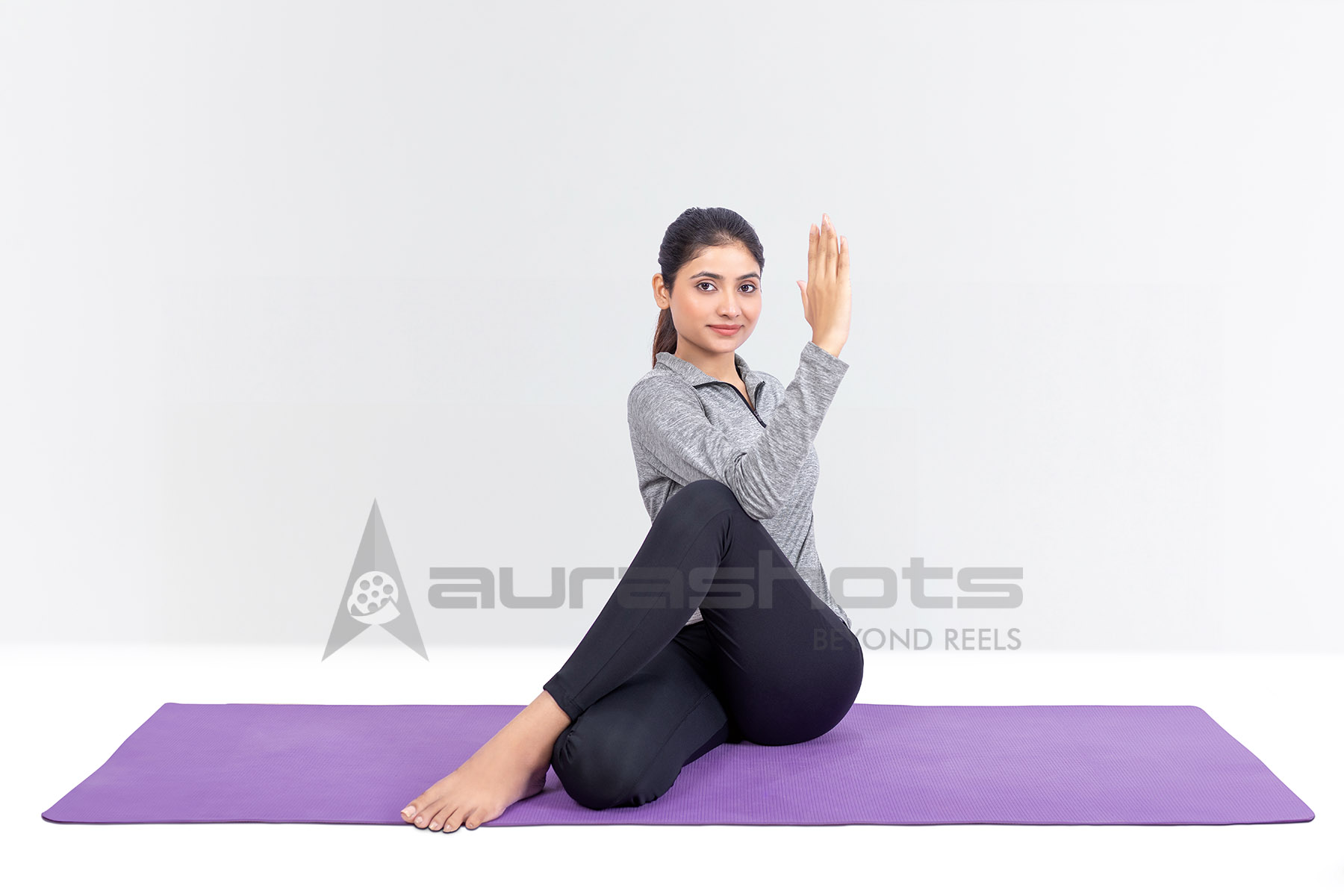 AS25020240-Young Indian woman seated cross-legged smiling during a relaxed yoga session